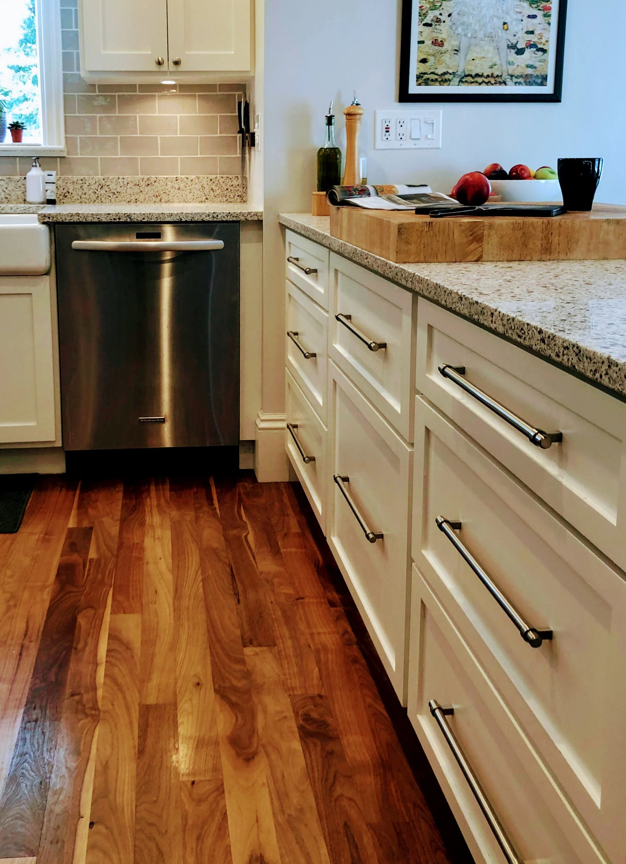 A gorgeous walnut slab led to an empty kitchen wall becoming something special - anchored by custom benches paired to the floor.